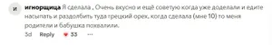 «Я сделала, очень вкусно. И еще советую, когда уже доделали и едите, насыпать и раздолбить туда грецкий орех, когда сделала (мне 10), то меня родители и бабушка похвалили».