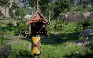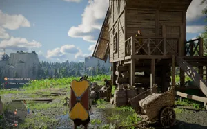 Справа от святилища можно подобрать лопату, а на ящиках у брошенной повозки прямо за ним — простенькие меч, щит и киянку. Кстати, ящики и бочки можно разбивать — в них попадаются еда, медяки, расходники и иногда даже куда более ценные вещи.