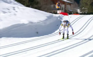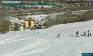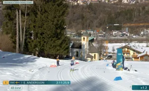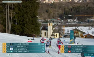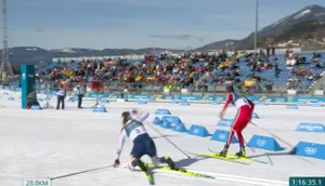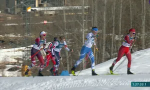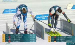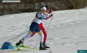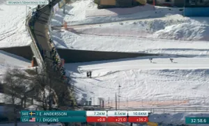 Эбба и Хайди меняют лыжи. Как и Джесс, Андерссон падает на выходе, но быстро поднимается.