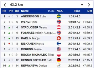 10,6 км — Венг и Эбба увеличивают преимущество, за ними Штадлобер. Непряева продолжает идти 12-й, уступая больше минуты.