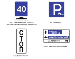 - Несколько знаков стало можно объединять в одном. К примеру, «Рекомендуемое ограничение скорости» могут разместить на щите с указателем «Искусственная неровность», а «Парковка» — вместе с изображением «Способ постановки транспортного средства на стоянку».