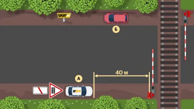 На картинке изображен знак 1.4.3, который уведомляет нас о том, что до переезда остается 50 метров. Кроме того, дополнительно сообщается, что водитель белого авто припарковался за 40 метров до переезда.