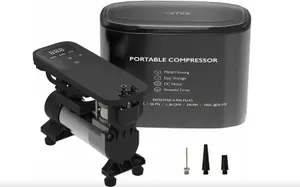 Недорогое мембранное устройство работает от автомобильной сети 12 В. Оснащен 3-метровым шнуром питания и воздушным шлангом 0,15 м, которые снимаются для удобства хранения. Заявлена производительность на входе 35 л/мин и максимальное давление до 10 атмосфер. На корпусе расположен светодиодный дисплей для отображения давления воздуха и кнопки для регулировки настроек. Предусмотрена автоматическая остановка при достижении выбранного давления. Встроенный фонарь кроме обычного освещения может подавать сигнал SOS. Устройство весит всего 600 граммов. В комплекте 3 насадки — для мяча, велосипедных шин и быстросъемный зажим.