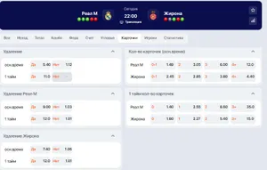 Смысл в том, чтобы угадать, покажет ли судья красную карточку в конкретном матче. Каждая БК может предлагать свои варинты ставок на удаления. Например, можно заключить пари на карточку для одной из команд (см. скрин).