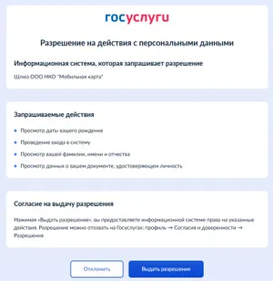 На Госуслугах после авторизации вы окажетесь на странице «Согласия», где в самом верху будет запрос от ООО НКО «Мобильная карта».
