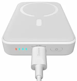 Корпус этой популярной модели изготовлен из легкого поликарбоната и оборудован выдвижной опорой. Во время зарядки устройство играет роль подставки для смартфона. Сверху расположен индикатор оставшегося заряда в процентах и кнопка для его активации. Несмотря на компактные размеры 105х69х20 мм, устройство весит 208 граммов. У него всего один двунаправленный порт USB-C с быстрой PD-зарядкой мощностью 20 Вт. Кроме этого, повербанк поддерживает беспроводную 15-ваттную QI-зарядку и совместим с магнитными чехлами смартфонов. Оба варианта коннекта можно использовать одновременно. Реализована надежная система для защиты от скачков напряжения, КЗ, перезаряда и перегрева. Девайс уверенно работает при температуре до -10 градусов. Двусторонний кабель Type-C входит в комплект.