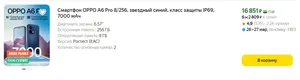 Девайс предлагают в версии Ростест (EAC), так что имеются все необходимые бэнды и предустановленные приложения. На данный момент OPPO A6 Pro можно купить от 16 800 р. у официального продавца бренда на Яндекс Маркете. За эту стоимость отдают смартфон в старшей конфигурации 8+256 ГБ. Самые быстрые могут сэкономить еще 700 р., применив в корзине промокод NEW700 до конца марта. Устройство продают в двух цветах на выбор, а в комплект входят адаптер и фирменный чехол.