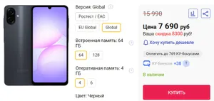 Лучший прайс на Samsung Galaxy A07 мы нашли в интернет-магазине Quke. Младшая конфигурация 4/64 Гб здесь обойдется в 7690 рублей. Доступны версии Global и Ростест (EAC), вся цветовая гамма, а также варианты с большим размером памяти. Продавец предлагает гарантию и сервисное обслуживание, доставку по России или самовывоз в 12 городах.