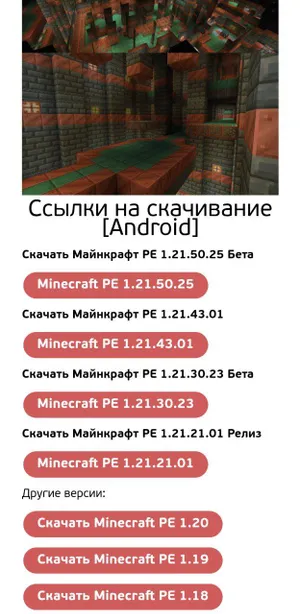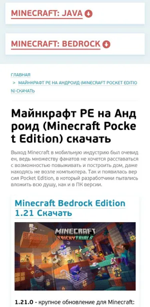 - Сразу после этого вы перейдете на новую страницу, где увидите все доступные для скачивания версии Майнкрафт PE. Можете выбрать любую, которая вам подходит. Например, Minecraft Bedrock Edition 1.21.