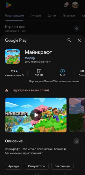 Официальная версия Minecraft для Андроид и айфонов, также, как и в случае с версией для ПК, недоступна для покупки и скачивания пользователям из России ни в Google Play, ни в App Store. Именно поэтому можно обратиться к тем же сторонним ресурсам.
