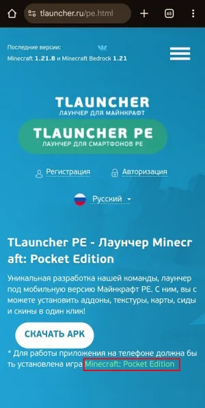 - Перейдите на главную страницу сайта TLauncher и нажмите «TLauncher PE».