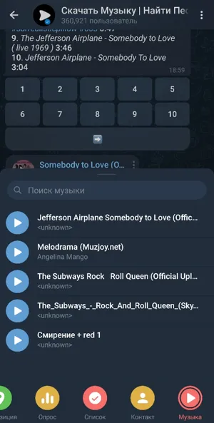 - Первым делом необходимо загрузить скачанную музыку в любой из чатов, например, в «Избранное» или найти трек с помощью бота в Telegram, например, здесь. В последнем случае достаточно ввести имя исполнителя и название песни.