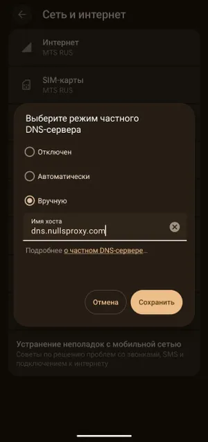 - Теперь вводим в строке частного DNS-сервера dns.nullsproxy.com;