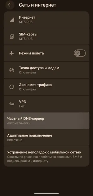 - Находим пункт «Частный DNS-сервер». (Либо для удобства можно найти этот пункт через поиск в «Настройках» на главной странице);