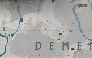 Ориентир для следующей локации — дорога, идущая прямо из буквы «Е» в надписи Demenesis на карте (это чуть севернее стены):