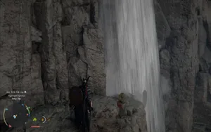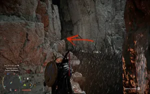 Спускаемся вниз на крыле и с помощью уже привычного «Колющего удара» (Shift + ПКМ, R2 + Треугольник, RT + Y) проникаем в пещеру за потоком воды и забираем Латные перчатки испепеляющего пламени.
