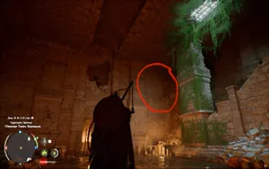 Забираемся по стене наверх, цепляемся за нее с помощью L2 (LT или Control) и применяем «Удар Пальмары» — стена прокрутится, и вы окажетесь внутри.