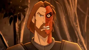 Для начала поясню, если вдруг вам не знаком этот персонаж. Двуликий — один из злодеев DC, который является альтер эго Харви Дента. В разных комиксах и фильмах его история претерпевает изменения, но в целом — это хороший парень, который стал плохим в связи со сложившимися обстоятельствами. Половина его лица обгорает, поэтому он и зовется Двуликим, а вместе с ним плавится и монета, которую он постоянно подкидывал для принятия решений еще задолго до становления в качестве злодея. Этого персонажа добавили в мультфильм «Ацтекский Бэтмен: Столкновение империй» в виде одного из предводителей кубинских мореплавателей. Этот герой изначально позиционирует себя как жестокого захватчика, а после получения раны он внезапно начинает постоянно подбрасывать монетку, пародируя того же Харви Дента, но главное — это его травма. Двуликим, с обгоревшей половиной лица и потемневшими с одной стороны головы волосами, он становится из-за пореза. Серьезно. Видимо у Женщины-кошки термоядерные когти, которые плавят кожу, иначе это просто невозможно объяснить. На картинке ниже та самая рана от одного удара ноготочками.