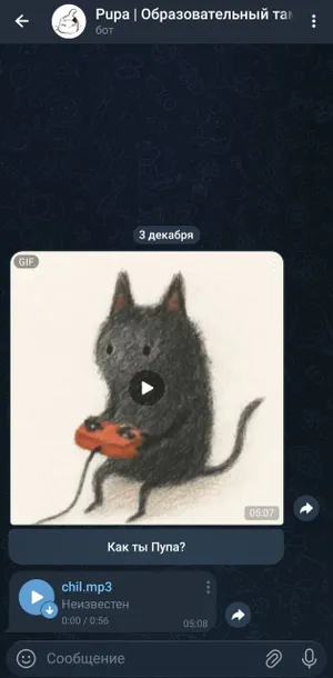 Эта игра — идеальный вариант для детей, подходящий для того, чтобы научиться заботиться о своем первом, для начала виртуальном питомце. На старте пользователи выбирают время, в которое котик Пупа будет ложиться спать, чтобы уведомления от бота не приходили посреди ночи, а затем просто ухаживают за новым любимцем прямо в Telegram — желают ему доброго утра, кормят, играют и вовремя укладывают спать. Каждое действие сопровождается забавными музыкальными вставками и очаровательными гифками, на которых котик потягивается на кровати, играет с клубком или сладко спит.