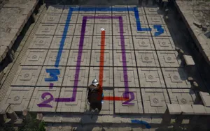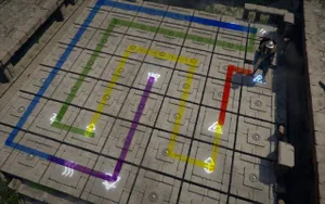 Решение загадки в Руинах утеса Отзвуков Эхо: в этой головоломке с символами на плитах вам нужно наступить на начальную плиту, а затем дойти по прямой до той, на которой изображен такой же символ. Цепочку при этом прерывать нельзя, равно как и пересекать уже проложенные линии.