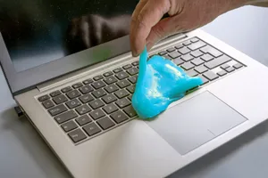 2. Переверните ноутбук и слегка потрясите, чтобы вытряхнуть крошки и пыль. Для более глубокой очистки можно использовать баллончик со сжатым воздухом или специальные щеточки (их можно приобрести на маркетплейсах). Также для очистки от мелкой пыли и крошек вам поможет слайм — липкая антистресс игрушка, которая отлично справляется с подобной задачей. Для этого вам необходимо быстро пройтись им по клавиатуре (быстро, так как при соприкосновении с теплом, слайм становится слишком липким).