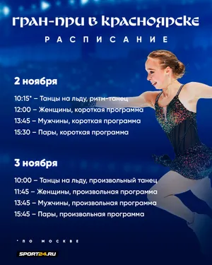 Отечественный Гран-при переезжает в Красноярск. Но так как текущая рабочая неделя — шестидневная, фигуристы начнут соревноваться не в привычную субботу, а в воскресенье. Медали будут разыграны на «Кристалл Арене».