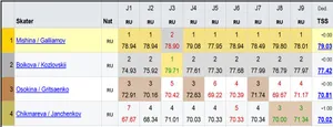 В короткой программе Мишина/Галлямов откатали чисто и получили достойные 79,03 балла. У Бойковой/Козловского случился степ-аут на выбросе, а еще партнерша «клюнула» на параллельном сальхове. Но арбитры отсудили лояльно: лишь одна -3 за степ; сальхов отгоили так, будто никакого «клева» и не было — из девяти арбитров только один дал -2, что отбросили, шесть из девяти поставили плюсы, двое вообще дали +2.