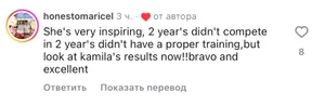 «Она очень вдохновляет, 2 года не участвовала в соревнованиях, 2 года не тренировалась должным образом, но посмотрите на результаты Камилы сейчас! Браво и отлично».