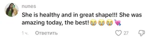 «Она выглядит здоровой и в прекрасной форме!!! Она была невероятна сегодня, лучшая!»