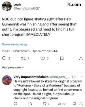 — Телеканал NBC включил трансляцию фигурного катания сразу после завершения проката Петра Гуменника, и, увидев этот костюм, я загорелась желанием немедленно посмотреть его программу полностью.