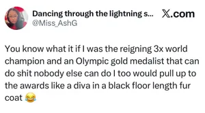 — Знаете, если бы я была трехкратной чемпионкой мира и олимпийской чемпионкой, которая может делать то, что не под силу другим, я бы тоже пришла на церемонию награждения как дива в черной шубе до пола.