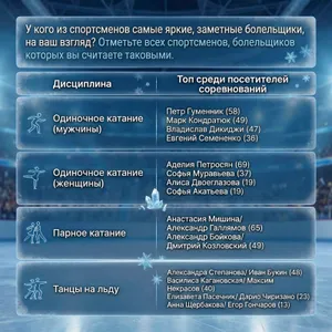 При этом «яркость» болельщиков воспринимается куда шире, чем формальное членство: по мнению зрителей, наиболее заметная поддержка у Петросян (69%), Мишиной/Галлямова (65%), Гуменника (58%). В танцах на льду выделяются болельщики дуэта Степанова/Букин (48%), хотя в фан-клубах состоят лишь 4% — то есть их «видимая» фан-база намного шире «официальной».