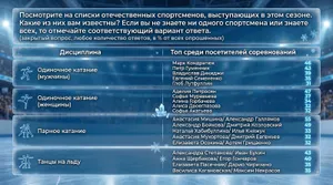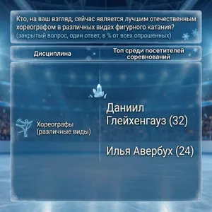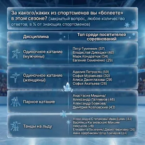 Танцы на льду. В танцах на льду чаще всего называли Александру Степанову и Ивана Букина (43%). Далее идут Анна Щербакова/Егор Гончаров (40%), а третью позицию делят Елизавета Пасечник/Дарио Чиризано и Василиса Кагановская/Максим Некрасов (по 35%).