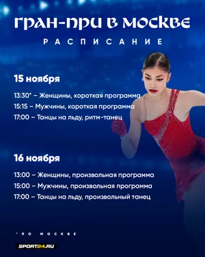 Всем привет! Продолжаем следить за отбором в финал российского Гран-при, на эти выходные серия приехала в Москву. Соревнования примет «ЦСКА Арена», в программе значатся три вида — мужская одиночка, женская одиночка и танцы. Будем внимательно за всем этим следить, оставайтесь с нами.