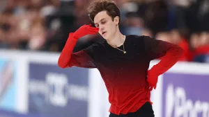 Петр Гуменник пошел на пятиквадку, сегодня получилось не все. Тем не менее на ультра-си выстоял, а вот с тройного флипа упал.