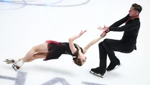 Екатерина Рыбакова и Иван Махноносов открыли финальную разминку хитами Bon Jovi. Довольны фигуристы прокатом, а судьи ставят 76,47.