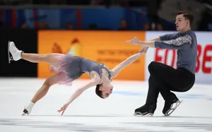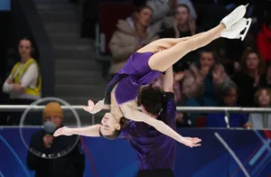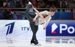 Екатерина Миронова и Евгений Устенко показали историю взаимоотношений человека и искусственного интеллекта — под музыку из фильма «Она». Пошатнуло партнершу на твизлах, были потери уровней и на других элементах.