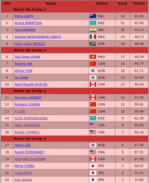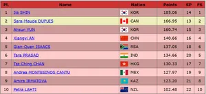 А вот и первая на сегодня попытка ультра-си — Сара-Мод Дюпюи немного недокрутила триксель и выехала в тройку. Была грязь и на других элементах, пропускает вперед себя Син Чжи А.