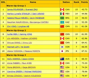 Лидируют Эмили Зингас/Вадим Колесник, чуть больше балла им проигрывают Кэролайн Грин/Майкл Парсонс. В другое время можно было бы ожидать от этой дуэли интригу, однако руководству американской сборной вряд ли выгодно, чтобы попавшие в основу на Игры Эмили и Влад уступили четвертому номеру сборной.