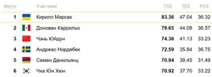 Всенародный любимец Донован Каррильо сегодня упал с квад-тулупа. Сальхов-тулуп (4-3) и непрыжковые были хороши, на трикселе заметен недокрут. Но для промежуточного лидерства хватает — 79,65.