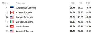 Стивен Гоголев — сын русских, эмигрировавших в Канаду. В олимпийском Милане занял 5-е место, здесь же наверняка желает улучшить тот результат. И первый шажок сделан: очень уверенное выступление с двумя квадами, хоть и не с самыми сложными. Все непрыжковые — четвертые уровни.