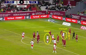 Тогда было видно, почему Угальде взял мяч — до этого Самошников пытался психологически давить на Барко. Игроки «Спартака» защитили аргентинца и отвели его подальше от штрафной.