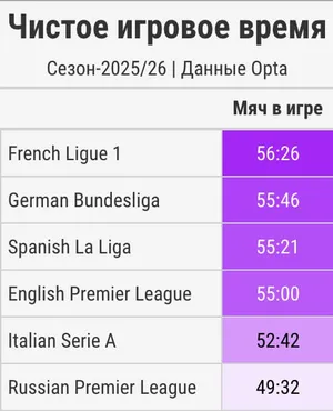 Данный показатель серьезно отстает от ведущих европейских чемпионатов. Например, разница с итальянской Серией А составляет три минуты (52:42). В топ-4 лиг чистое время начинается с 55 минут, а рекорд принадлежит французской Лиге 1 (56:26).