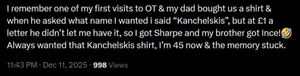 @FPLShark: «Я помню один из своих первых визитов в OT, когда мой отец купил нам футболки и спросил, какое имя я хочу, я ответил «Канчельскис», но за 1 фунт за букву он не разрешил мне его взять, поэтому я получил футболку Шарпа, а мой брат — Инса! 🤣Я всегда хотел эту футболку с именем Канчельскис, мне сейчас 45, но это воспоминание осталось со мной».