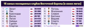 В пятерке самых посещаемых клубов Восточной Европы также и польские гранды— «Лех» с показателем 30 390 зрителей, «Висла» Краков с 26 191 и «Легия» с 24 472. «Балтика» занимает двенадцатую строку с 17 549 зрителями, «Ротор» фиксируется на пятнадцатой — с 16 136. А у «Спартака» — 8-е место (23 183).