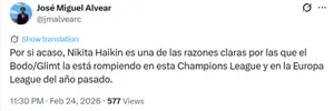 @jmalvearc: «На всякий случай, Никита Хайкин — одна из очевидных причин, по которым «Буде-Глимт» так успешно выступает в этом сезоне Лиги чемпионов и в прошлогодней Лиге Европы».
