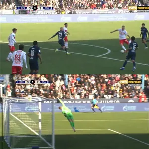 Другое полезное действие Денисова в первом тайме — стеночка с Ву. Выглядело максимально необычно, ведь два защитника разогнали атаку в одиночку. Ву прорвался по бровке, обыгрался с Денисовым в полуфланге и с мячом убежал в пустую зону.