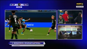 «После видеопросмотра наказывается игрок команды «Зенит», 20-й номер Педро, за серьезное нарушение правил игры: открытая стопа, высокий контакт. Решение — красная карточка».