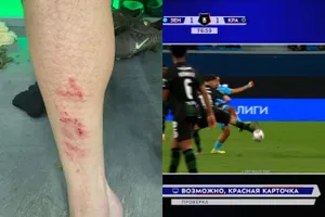 Педро попал шипами в середину ноги Сперцяна. Такая высота — отягчающий критерий, отделяющий желтую карточку от красной. Это подтверждает фото ноги Сперцяна после матча — на ней остались следы от шипов Педро.
