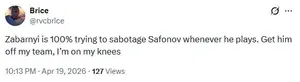 @rvcbrice: «Забарный на 100% пытается помешать Сафонову каждый раз, когда тот выходит на поле. Уберите его из моей команды, я умоляю на коленях».
